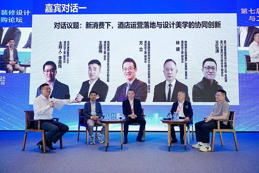 在论坛的嘉宾对话环节,两场高水平的思维碰撞为与会者带来了深刻启发。首场对话《融合自然,互鉴古今——国际视野下的酒店叙事设计》由酒店设工委副会长、元开酒店集团CEO李晨炜主持,酒店设工委副会长会长、悦榕集团原项目开发与设计副总裁王建伟,酒店设工委副会长副会长、纳瑞德文旅健康产业集团董事长林健,酒店设工委副会长副会长、金陵国际装饰设计工程实业有限公司董事长方立,厦门市室内设计师协会副会长、厦门道恩建筑设计有限公司总经理王弘涛等业界领袖,就如何将传统文化精髓与现代设计语言相融合展开深入探讨。