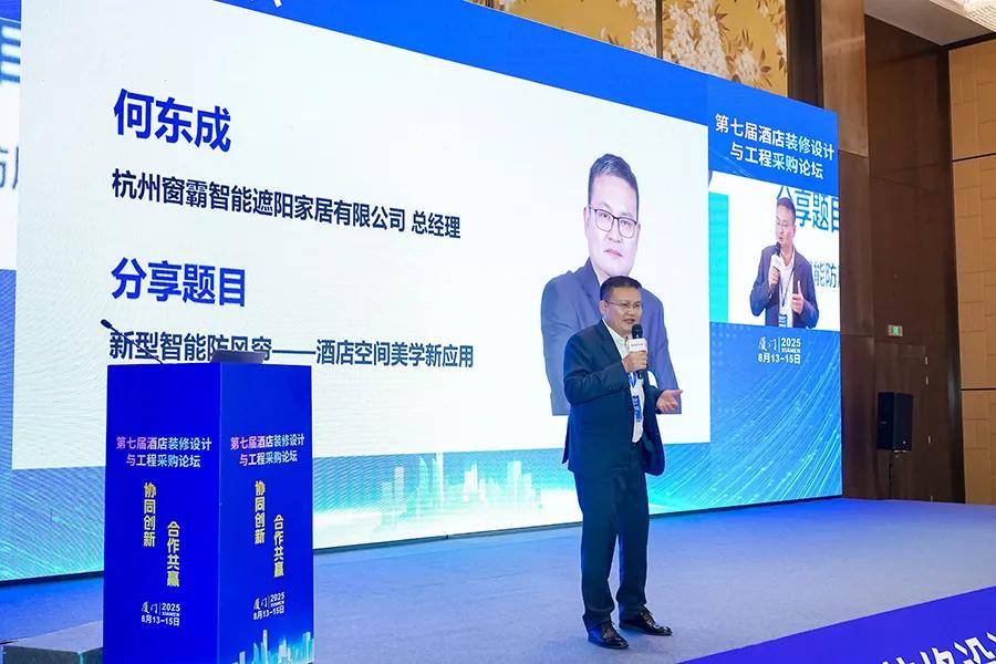 杭州窗霸智能遮阳家居有限公司总经理何东成发表了主题演讲《新型智能防风帘-酒店空间美学新应用》
